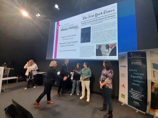 Les élèves de 1ère EDS Anglais, Hanna Afkir et Elina Amadieu, ont brillamment remporté le 2ᵉ prix de ce concours dédié à la lutte contre les fake news.