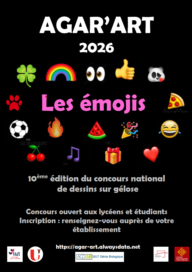 Le concours Agar’Art est un concours national de dessin sur milieux de culture appelés «gélose » et contenant de l’agar (d’où le nom du concours), un gélifiant permettant de rendre ce milieu solide. Les dessins sont réalisés avec des micro-organismes qui, lorsque leurs besoins nutritionnels et de conditions de croissance sont respectés, se développent sur ces milieux en formant des « colonies » visibles à l’œil nu (ces colonies correspondent à des « amas de micro-organismes »).
