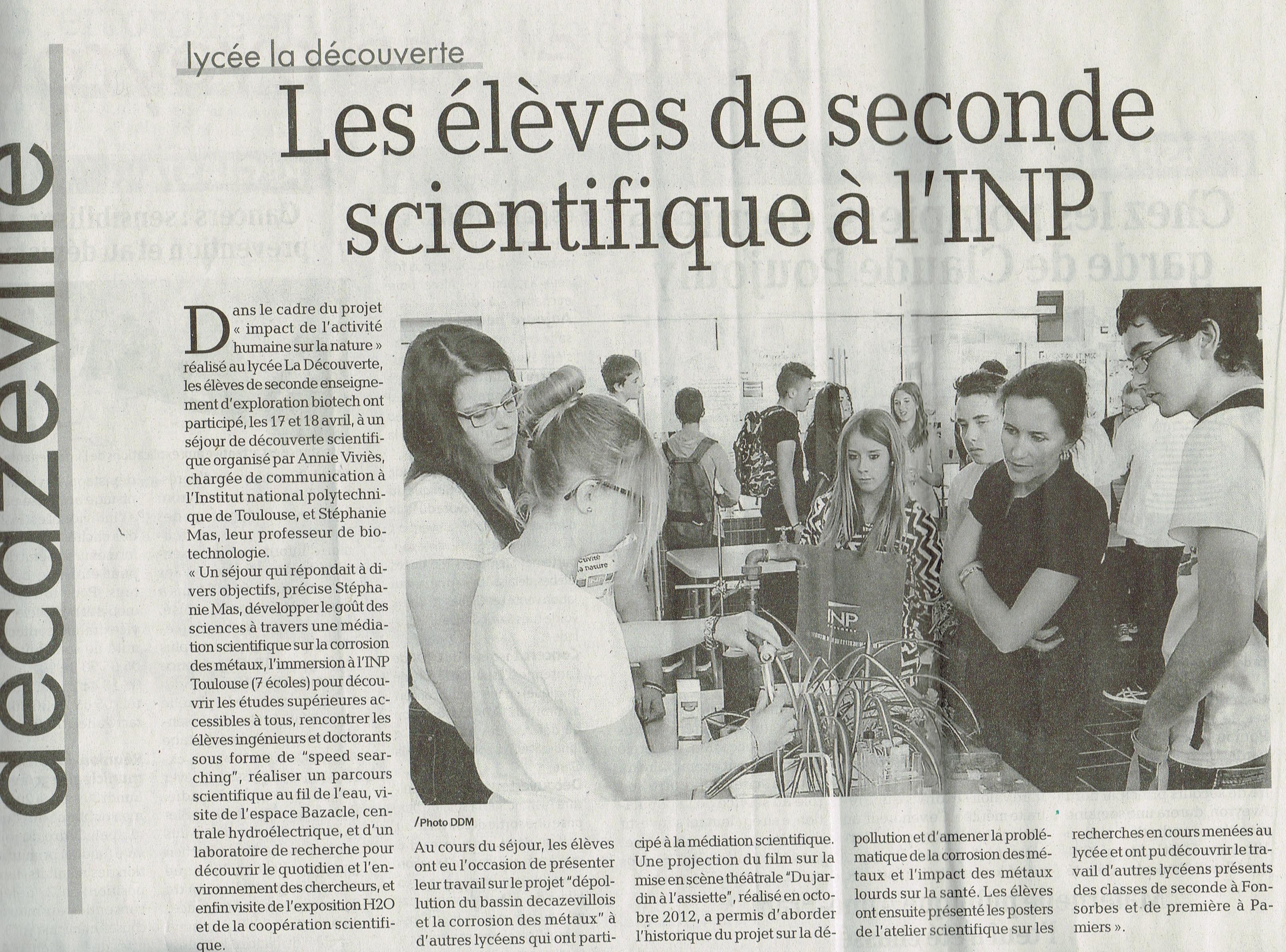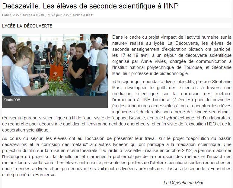 Dans le cadre du projet Impact de l'activité humaine sur la nature mené au lycée la découverte à Decazeville. Les élèves de seconde enseignement d’exploration Biotech ont participé, les jeudi 17 et vendredi 18 avril 2014 à un séjour de découverte scientifique organisé par Annie Vivies chargée de communication à l’INP Institut National Polytechnique de Toulouse et Melle Mas professeur de biotechnologie au lycée « La Découverte » de Decazeville.