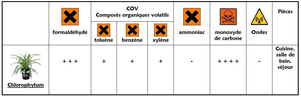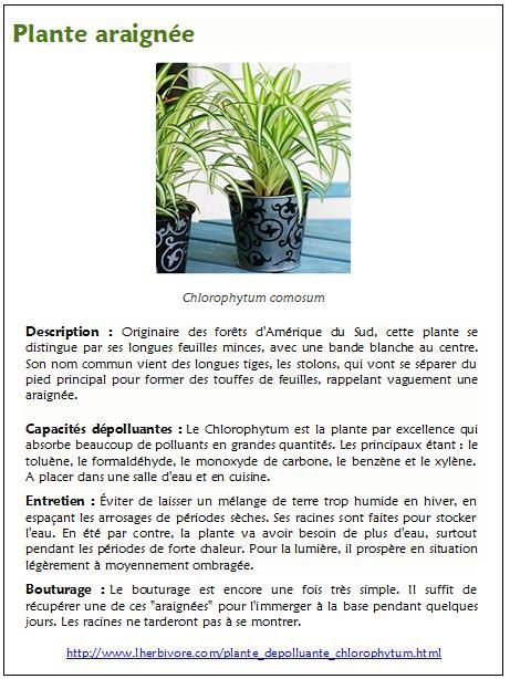 Le Chlorophytum, plus communément appelé "plante araignée" est une plante très utile pour dépolluer l'air et absorber les polluants atmosphériques comme le monoxyde de carbone, le formaldéhyde...